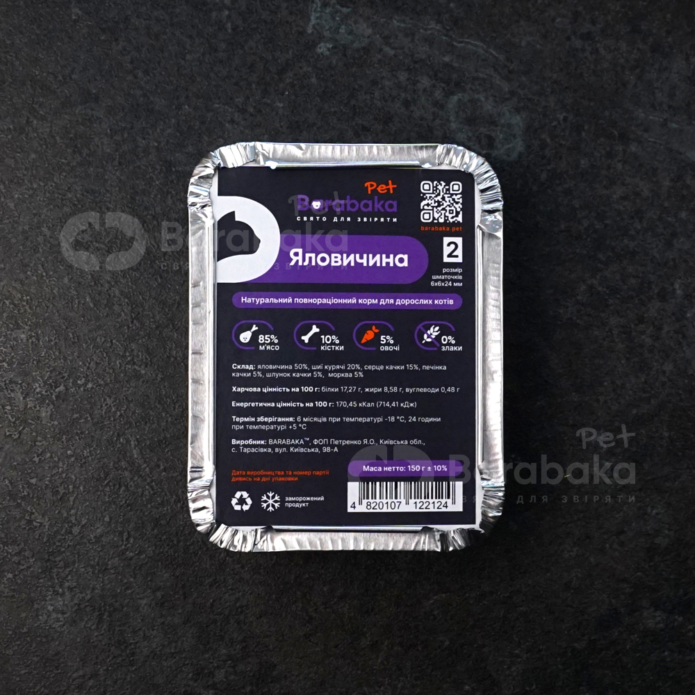 Мікс з Яловичиною - складається з дрібно порізаної яловичини (м'язове м'ясо), качиних субпродуктів – сердець, печінки та шлунків, рубаних на дрібні частини курячих ший, з додаванням невеликої кількості дрібно нашаткованої моркви.