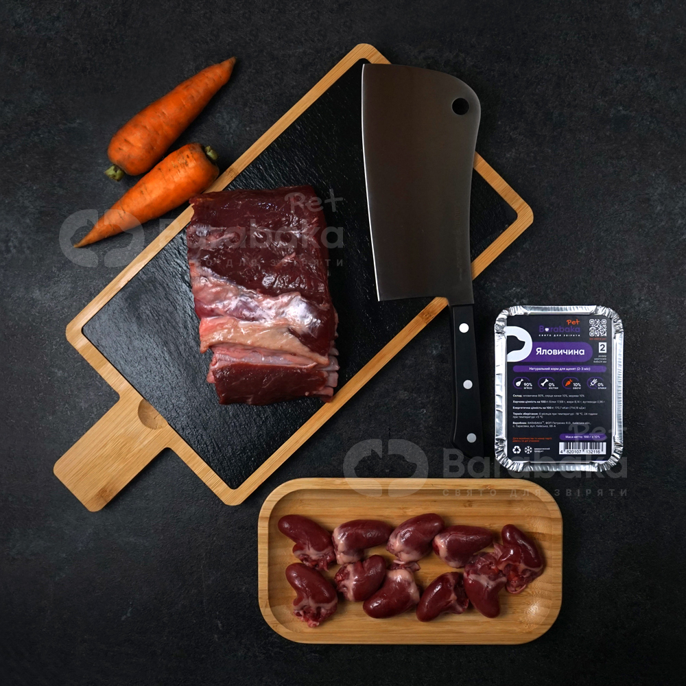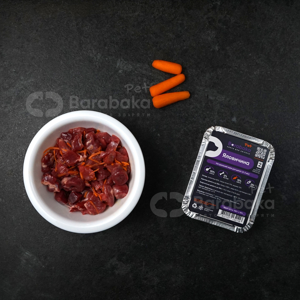 Яловичина для щенят (2-3 міс) - складається з дрібно порізаної яловичини (м'язове м'ясо), з додаванням невеликої кількості качиних сердець та дрібно нашаткованої моркви.